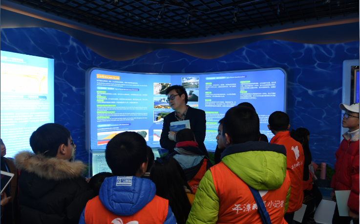 在大記者吳平平的帶領(lǐng)下,《平潭時報》20余位小記者參觀了國家海洋局海島研究中心規(guī)劃展示大廳、海島知識宣傳展廊、海島科普館,并觀看了海島研究中心宣傳片。